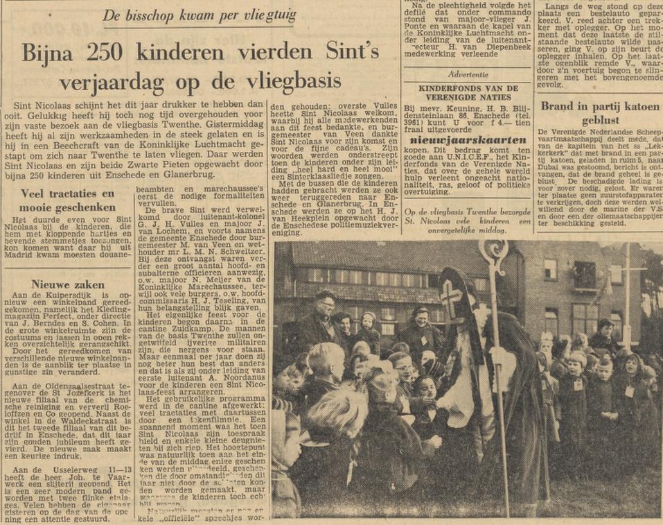 In 1955 kwam Sint Nicolaas per vliegtuig op de vliegbasis Twente. Krantenbericht Tubantia 3-12-1955.