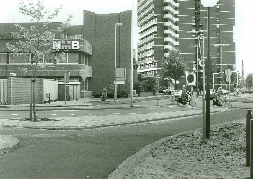 Boulevard 1945-1 Zicht op ITC flat (Dish hotel) hoek Haaksbergerstraat en NMB bank vanuit Nijverheidstraat 1983.jpg