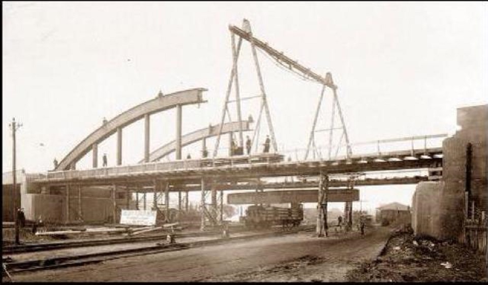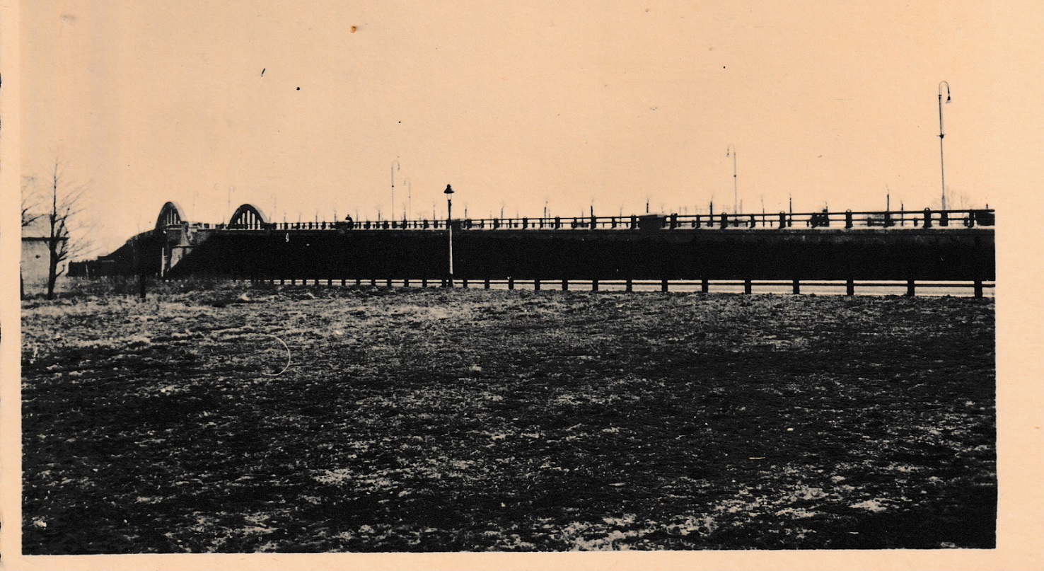 Er staan wel een rijtje bomen lijkt het achter de brug. Dan zou het de kant van waar nu dat winkelcentrum is, moeten zijn?