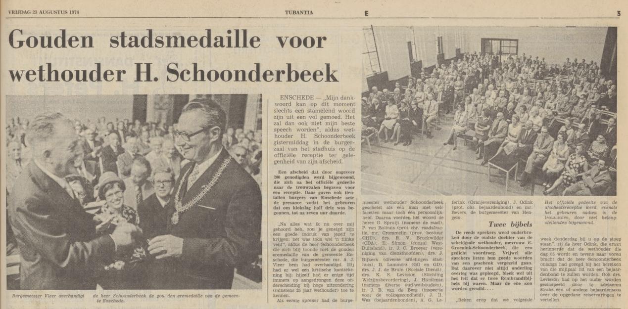 Bij zijn afscheid als wethouder krijgt H. Schoonderbeek de goude erepenning van de Gemeente Enschede, zie krantenbericht Tubantia 23-8-1974.
