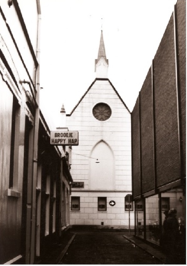 Menistenstraat 3 Broodje Happy Hap richting Stadsgravenstraat Doopsgezinde of Menistenkerk 1976.jpg