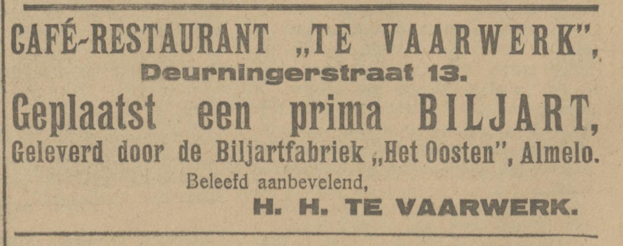 Eerder zat in het pand Deurningerstraat 13 ook nog cafe billard Muller en daarvoor cafe G. Krone en cafe restaurant Te Vaarwerk.