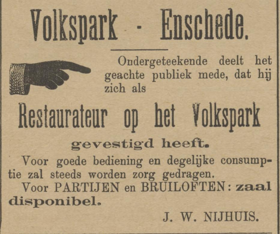 Parkweg Volkspark restaurant uitbater J.W. Nijhuis advertentie Tubantia 12-11-1892.jpg