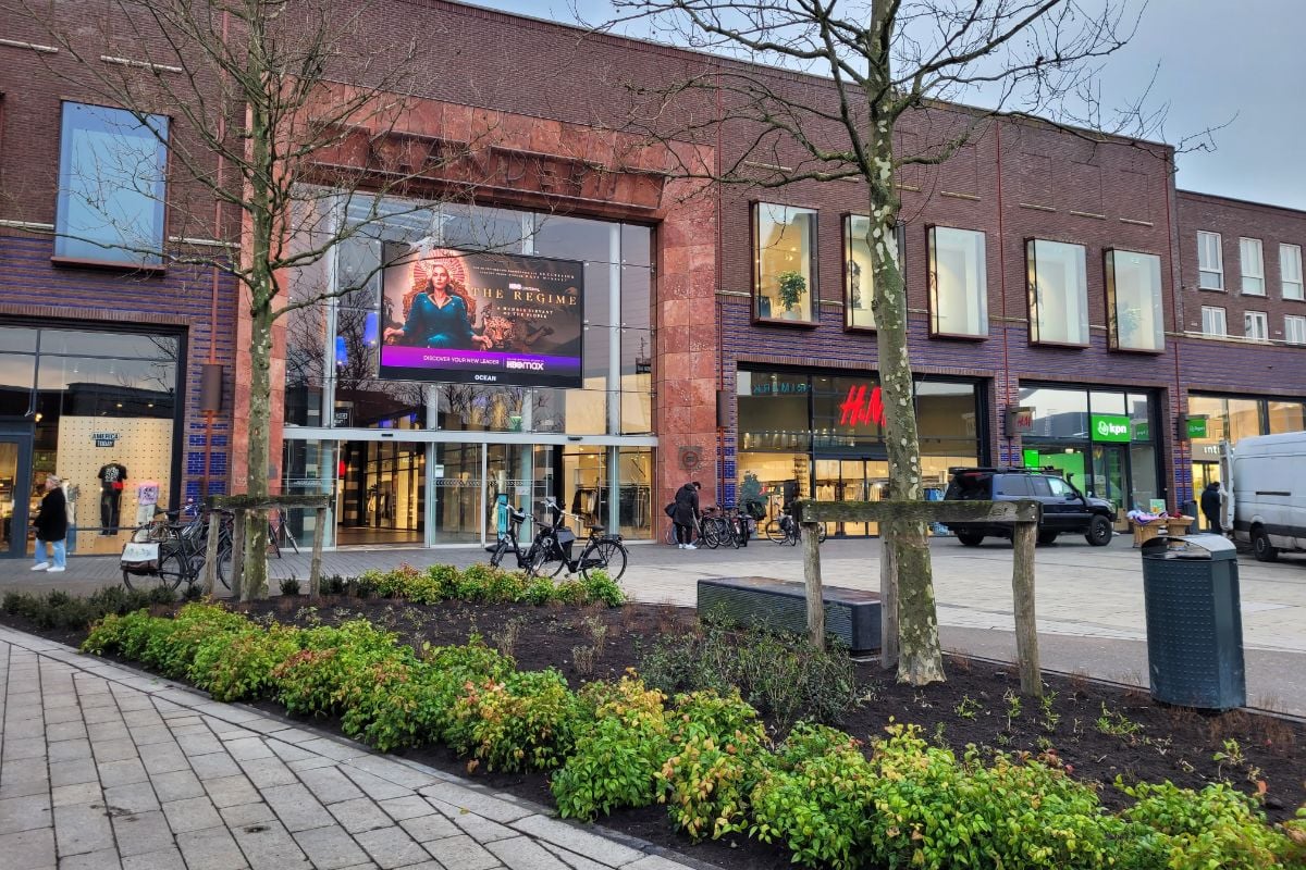 Wie eerder deze week op het Enschedese winkelplein liep, zag containers gevuld met zwart zand. Inmiddels zitten er ook planten in.