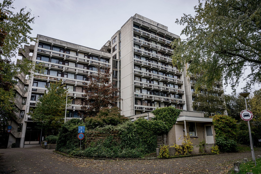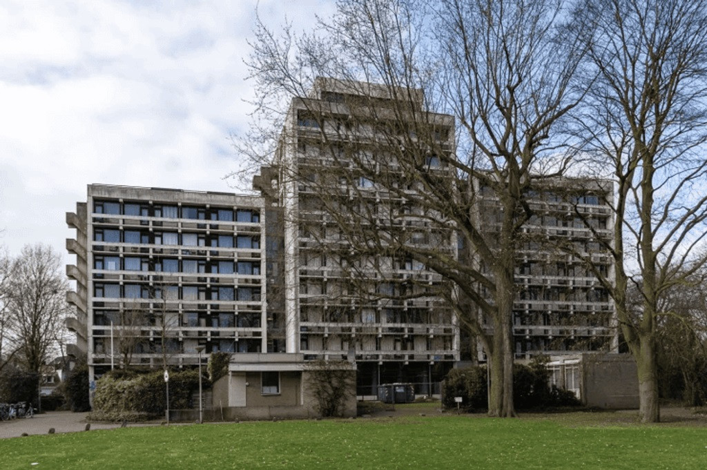 Veel van de gebouwen in die stroming pasten niet zo goed bij de Nederlandse opvatting van mooie gebouwen, zegt Heemschut. Ze waren nogal dwingend en grepen soms fors in in hun omgeving. Zo ook in Enschede, aan de rand van het Volkspark, tussen de vooroorlogse huizen aan de Emmastraat en Parkstraat. Tien hoog beton met kleine appartementen voor leerling-verpleegkundigen van het toenmalige ziekenhuis Stadsmaten. Daarna woonden er studenten en nu staat het pand leeg.