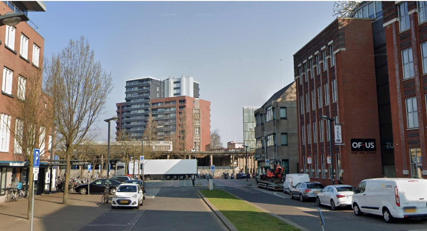 Stationsplein 33 zicht op Parkweg hoek Piet Heinstraat vanuit terras stationsrestauratie.jpg