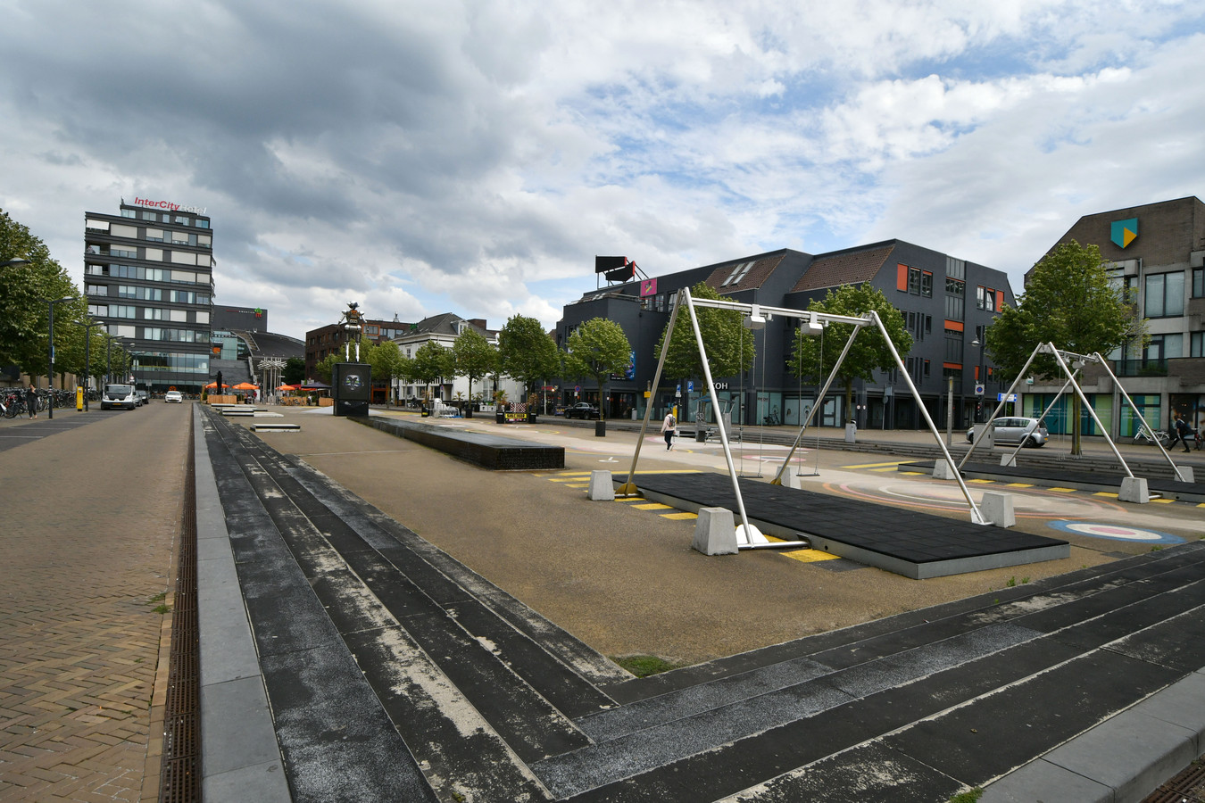 Het Stationsplein gaat dit jaar op de schop. Nu staan daar nog de muziekschommels en draaitafels die 100%Fat bedacht. Waar die blijven, is nog onbekend. © Carlo ter Ellen DPG Media.jpg