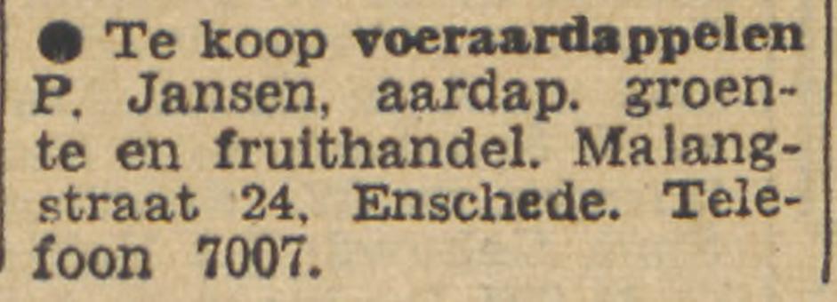 Malangstraat 24 P. Jansen groente- en fruithandel advertentie Tubantia 31-12-1953 en 14-7-1956