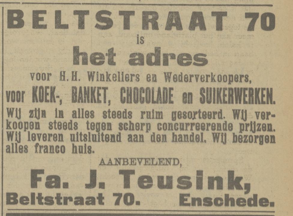 Beltstraat 70 Fa. J. Teusink Koek, Banket, Chocolade en Suikerwerken advertentie Tubantia 28-1-1926