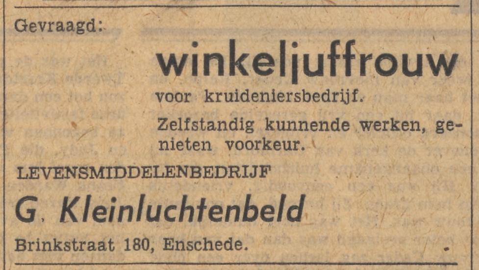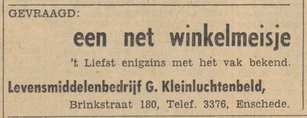 Brinkstraat 180 Levensmiddelenbedrijf G. Kleinluchtenbeld advertentie Tubantia 12-3-1958, 6-8-1959, 20-10-1959