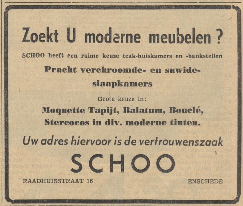 Raadhuisstraat 16 SCHOO meubelen advertentie Tubantia 10-12-1959