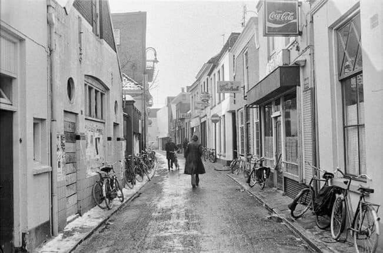Noorderhagen 71-73 Achterzijde van Fietsenzaak Offrein Oldenzaalsestraat 25-33, SIWA Shop en café De Halve Maan. 22-1-1978.jpg