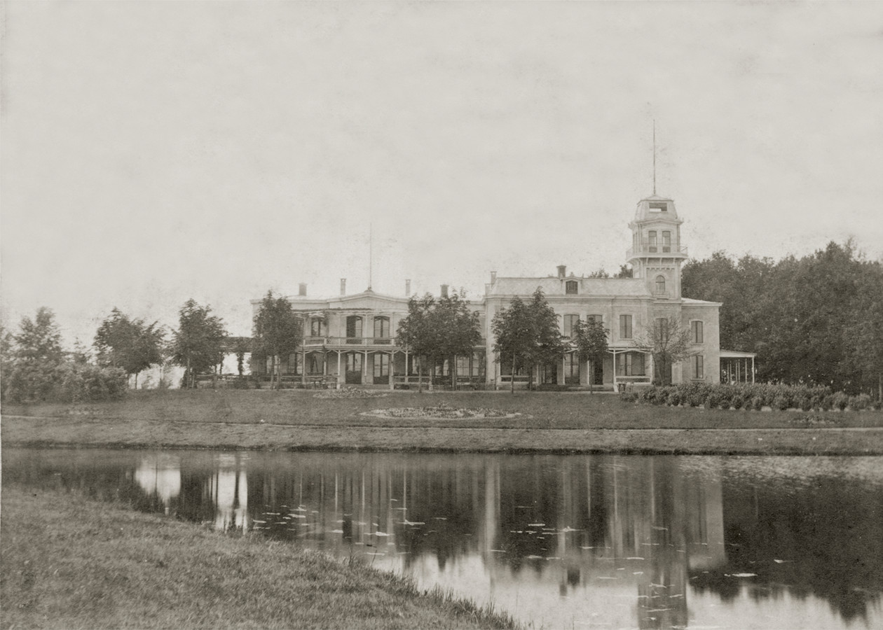 Het Parkgebouw rond 1880 na de uitbreiding, met rechts de later weer verdwenen toren. © Worp, H.W. van der