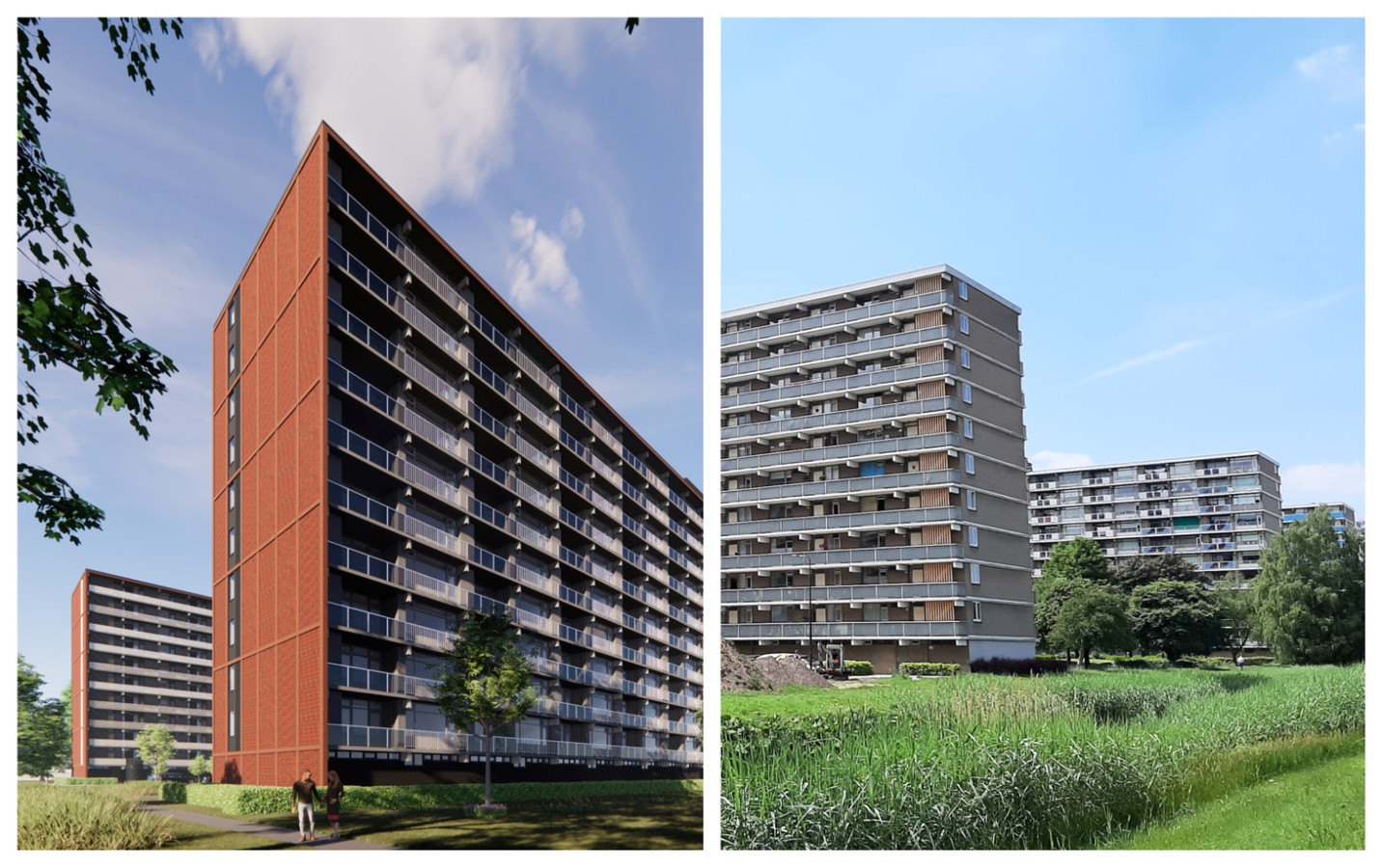 De vier beeldbepalende flats worden energiezuinig, met een nieuw, fris en modern uiterlijk. Deze week al begint het werk aan de eerste flat van 10 hoog met honderd woningen, die met de huisnummers 2 tot en met 200.