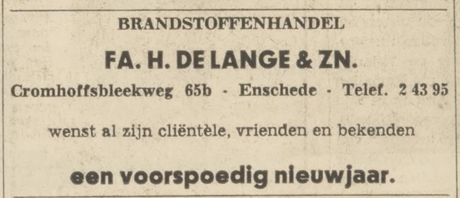 Cromhoffsbleekweg 65B Brandstoffenhandel H. de Lange & Zn. advertentie Tubantia 30-12-1967