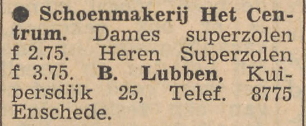 Kuipersdijk 25 Schoenmakerij Het Centrum B. Lubben advertentie Tubantia 17-8-1955