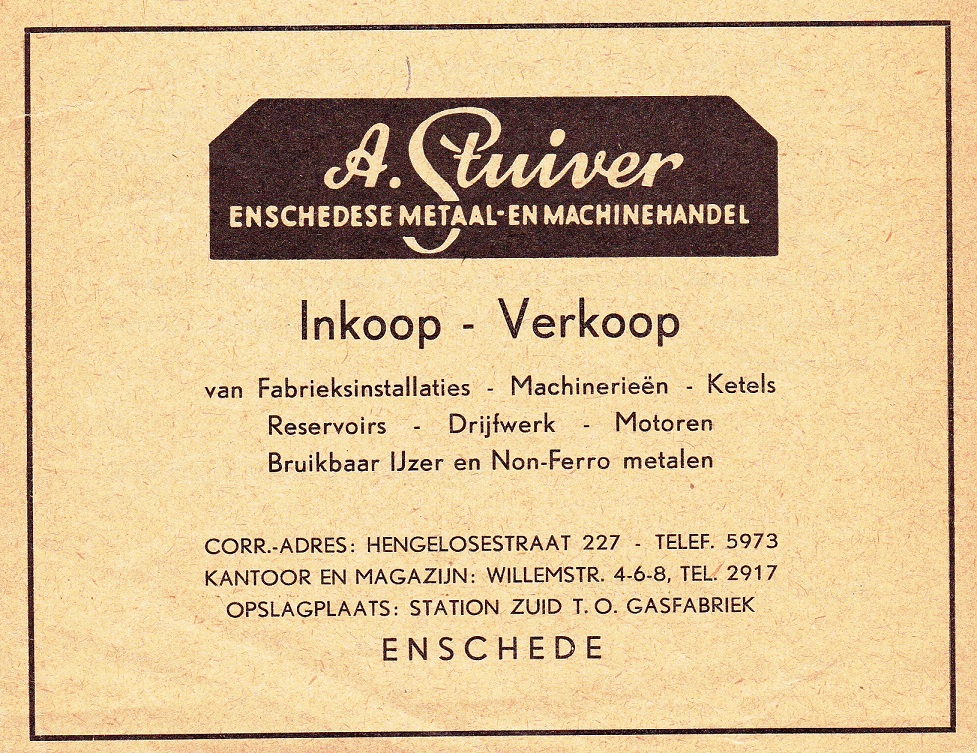Willemsraat 4-6-8 Enschedese Metaal- en Machinehandel A. Stuiver advertentie adresboek 1953