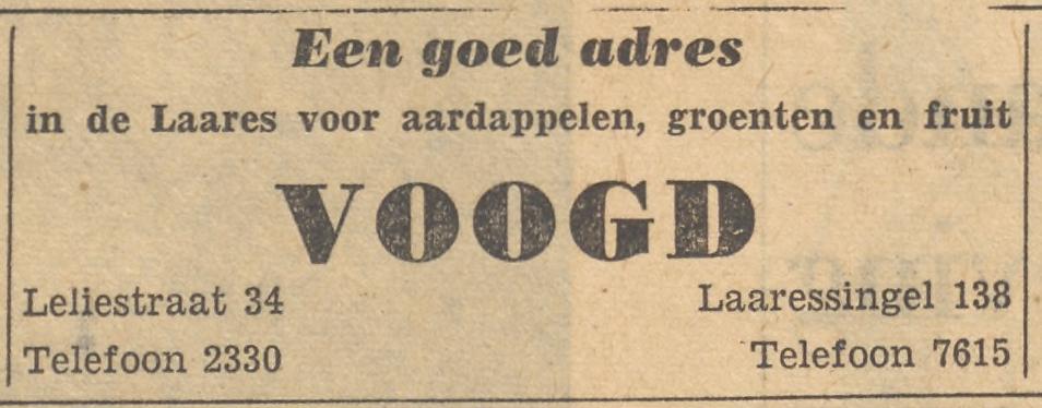 Laaressingel 138 Leliestraat 34 groentezaak Voogd advertentie Tubantia 1-7-1954.