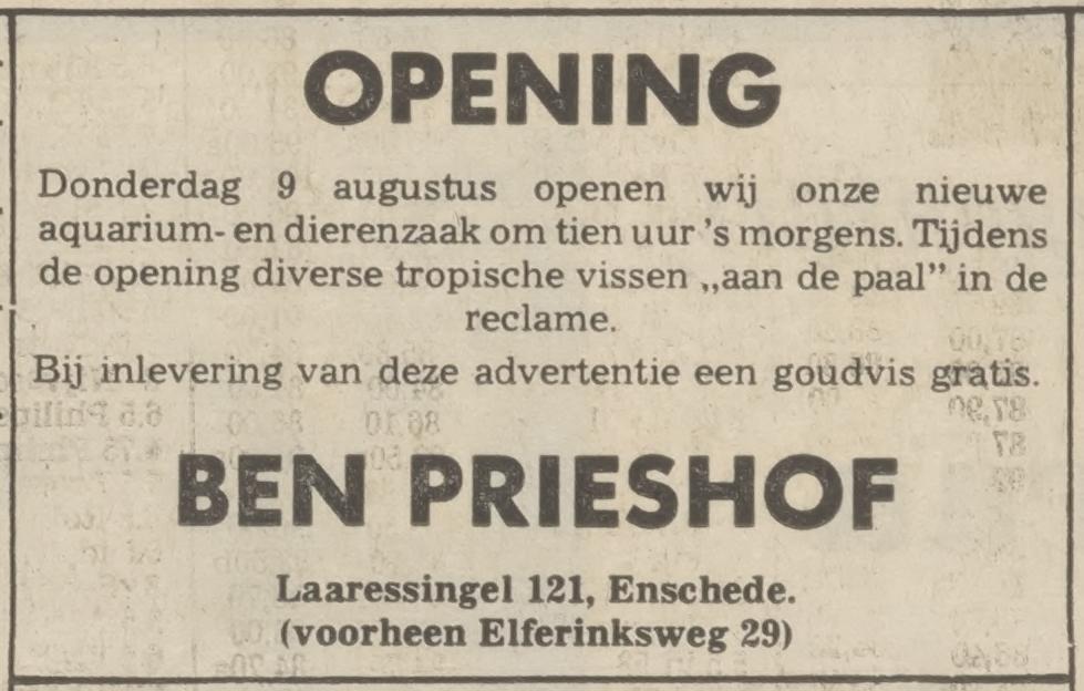 Laaressingel 121 dierenzaak Ben Prieshof advertentie Tubantia 8-8-1973
