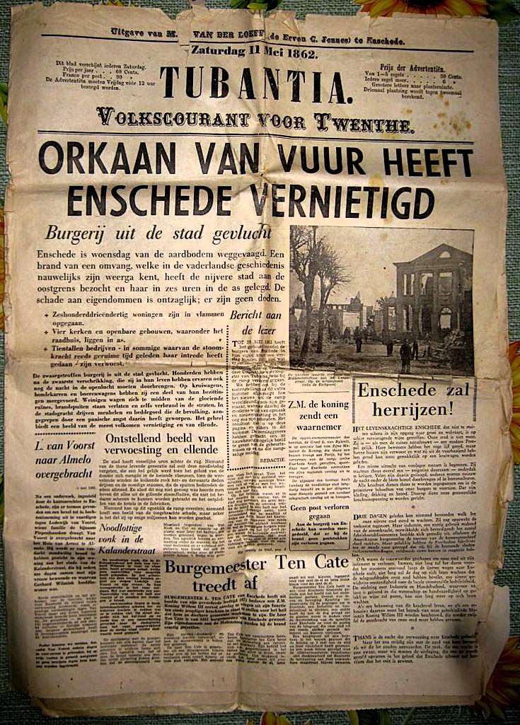 Dagblad Tubantia met nieuws stadsbrand 11-5-1862. zie: https://cultureelerfgoedenschede.nl/sta ... ei-1862-2/