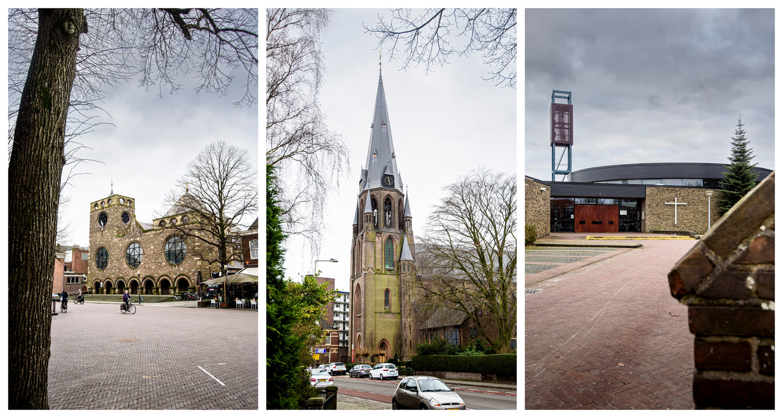 De drie katholieke kerken in Enschede. Vanaf links: de Jacobuskerk, de St. Jozefkerk en de St. Jankerk. © Reinier van Willigen