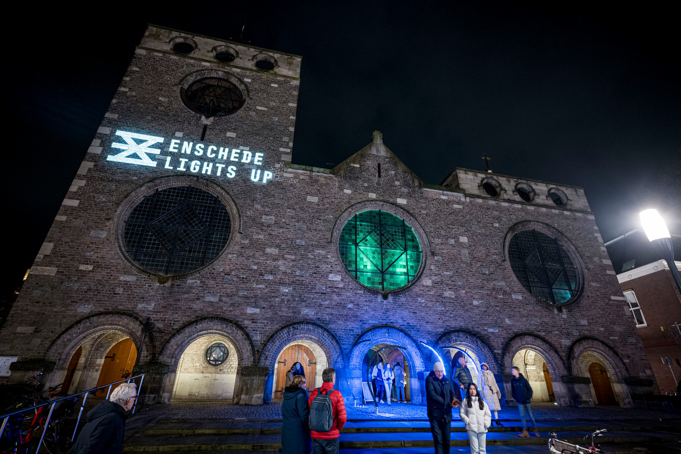 Kan een af te stoten heilig huis terugkeren als club om te feesten en te vieren? De show in de Jacobuskerk tijdens Enschede Lights Up. © Emiel Muijderman