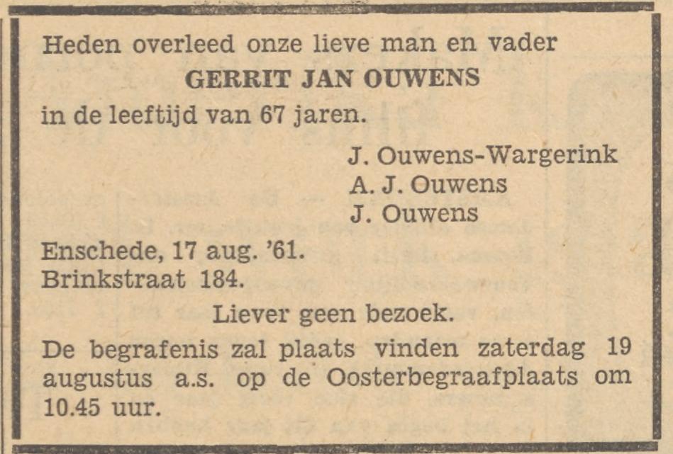 Brinkstraat 184 G.J. Ouwens overlijdensadvertentie Tubantia 17-8-1961.jpg