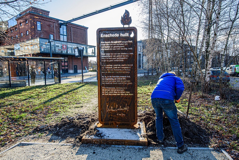 Het is iets na elven in de ochtend als Graddus Strobos van het gelijknamige metaalbedrijf uit Hengelo het nieuwe monument met een paar stevige bouten vastzet. „Zo, die staat”, zegt hij over de eeuwige verankering van het gedicht waarin Willem Wilmink (1936-2003) Enschede op magistrale wijze toespreekt na de catastrofe van 13 mei 2000. Met doorzichtige en ingegraveerde letters leest de voorbijganger alles over Een buurt, die wel veel zorgen had / maar die ook vol verhalen zat (…)