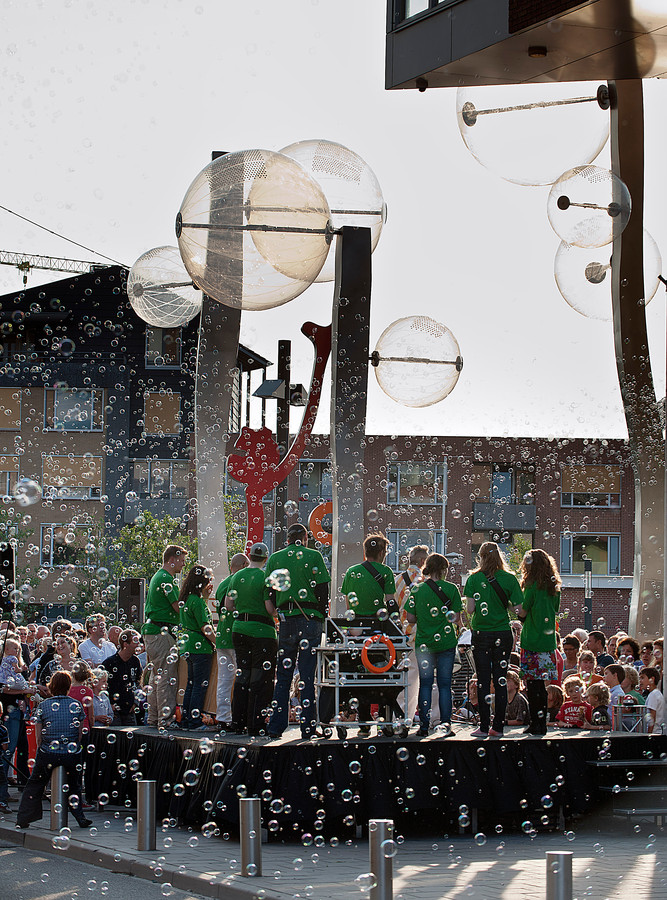 De bollen maken deel uit van het kunstwerk de Bellenblazer. Twee figuren lijken zeepbellen, de kunststof bollen, de wijk in te blazen. Als het koud is kleuren de bollen blauw, is het warm dan zijn ze rood verlicht. De wind beïnvloedt hoe het licht de bol kleurt en als er iemand voorbijloopt hoor je heel zachtjes een plop, alsof een zeepbel uit elkaar spat.