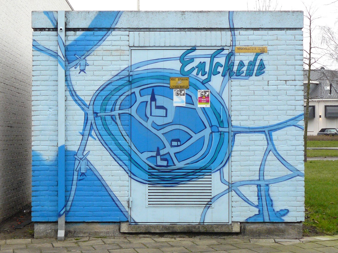 Deze muurschilderingen van historisch Enschede zijn te vinden in een hoekje van de wijk Laares. Ze zijn geplaatst naar een initiatief uit 2013 van Gerrie Welcker. Ze had genoeg van de lelijke stroomkastjes in de wijk en kwam met een voorstel om deze op te sieren. Aldus Gerrie; “Ik heb de eigenaren aangeschreven, ben bij de vergadering van de wijkcommissie geweest, heb een begroting gemaakt en zo heb ik het plan uitgewerkt. Dit plan heb ik diverse keren aan wijkbewoners laten zien, met de afbeeldingen erbij. Men was enthousiast, en zo is het project door iedereen goed ontvangen.”