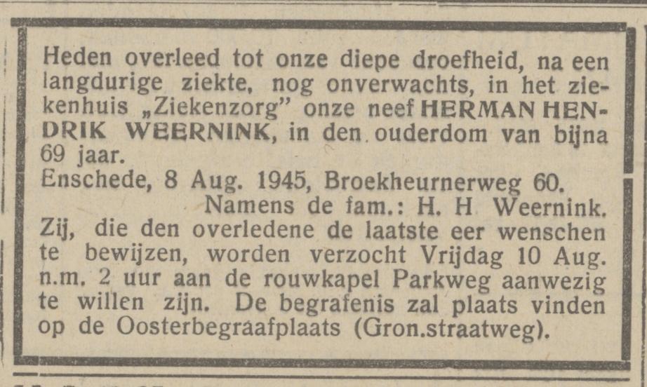 Broekheurnerweg 60 H.H. Weernink overlijdensadvertentie Het Parool 9-8-1945.jpg