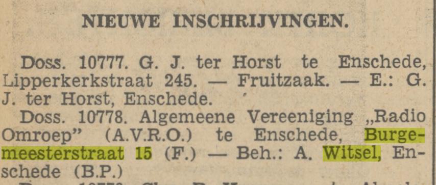Witsel A. de propagandist "A.V.R.O." bijkantoor Burgemeesterstraat 15 krantenbericht 30-3-1937