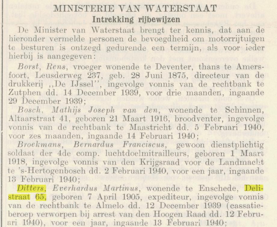 Ditters E.M. expediteur Delistraat 65 krantenbericht 9-3-1940