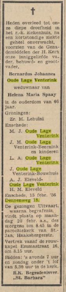 Ddennenweg 18 B.J. Oude Lage Venterink overlijdensadvertentie Twentsche Courant 17-12-1956.jpg