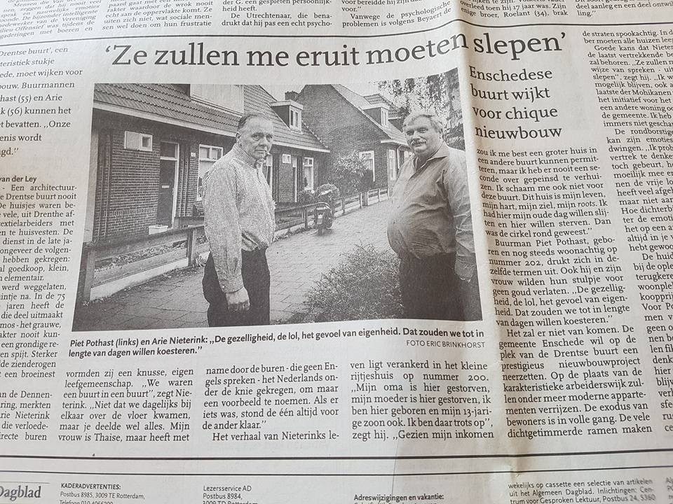 Het grootst gedeelte van onze buurt was het niet mee eens met deze sloop en gedwongen verhuizing en heb daarover samen met mijn buurman Piet Pothast een interview gehad met een reporter van het Algemeen Dagblad. zie bijgaand krantenbericht van 27-5-2002.