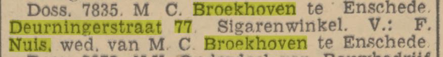 Broekhoven-Nuis Wed. F. sigarenwinkel Deurningerstraat 77 advertentie 29-3-1938 en krantenbericht 14-2-1940