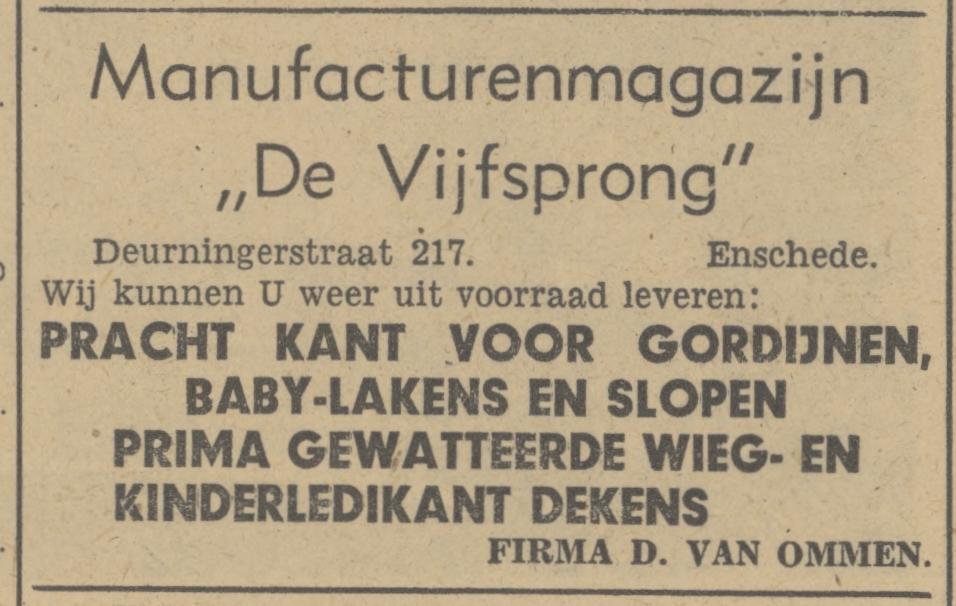 Deurningerstraat 217 manufacturenmagazijn De Vijfsprong Firma D. van Ommen advertentie Tubantia 6-3-1948.jpg