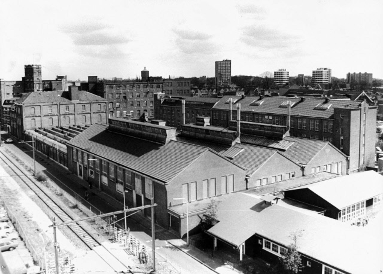 Parallelweg 15 Uitzicht vanaf gebouw Dienst Openbare Werken op de fabriek Van Heek & Co. aan de Noorderhagen Op de voorgrond schoolplein van Ariënscollege eerder St. Jacobus Jongensschool Kloosterstraat 4.jpeg