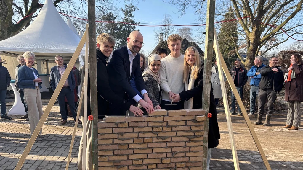 ENSCHEDE - De vernieuwbouw van Bonhoeffer College aan de Van der Waalslaan is maandag begonnen met een officiële starthandeling. In een stralend februarizonnetje had wethouder Harmjan Vedder de eer om samen met een aantal leerlingen de eerste stenen te metselen. Deze symbolische handeling markeert het begin van de opbouwfase na de sloopwerkzaamheden. De wethouder benadrukte het belang van goed onderwijs voor de Enschedese jeugd en de belangrijke rol die de school en ook de gemeente Enschede daarin heeft. “Deze vernieuwbouw biedt ons de kans om een inspirerende leeromgeving te creëren die aansluit bij de behoeften van de toekomst’’, aldus de wethouder. “Het is essentieel dat we investeren in de ontwikkeling van onze jongeren en hen de beste kansen bieden.”