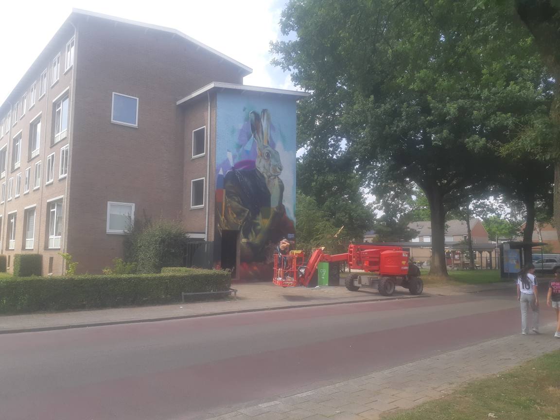 Bij het flatgebouw aan de Ferdinand Bolstraat 20-40 is een kunstenaar bezig een muurschildering te maken van een konijn. Helaas geen duidelijke foto's gemaakt met mijn mobiele telefoon.