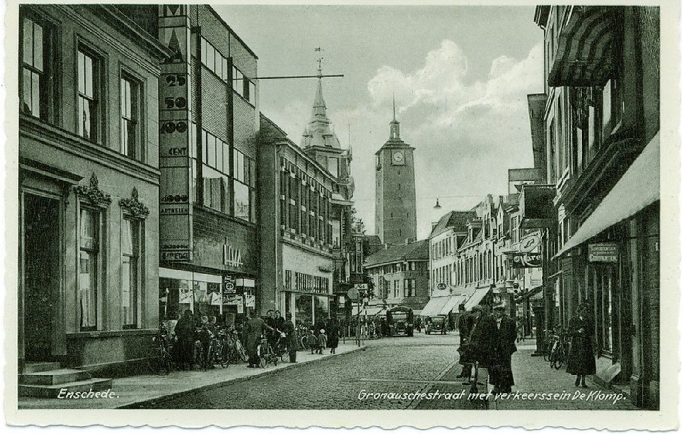 Het pand Magasin de Paris lederwaren van A. Bult op de hoek kruispunt De Klomp Gronausestraat 2 en Kalanderstraat is door een bombardement van 22-2-1944 geheel verwoest. zie krantenbericht Tubantia 17-10-153. Eerder zat in dit pand cafe De Top. Later zat op die hoek de Hema.