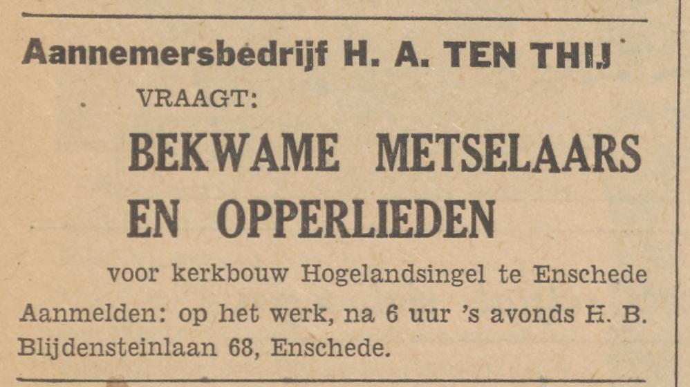 H.B. Blijdensteinlaan 68 Aannemersbedrijf H.A. ten Thij advertentie Tubantia 8-10-1953.jpg