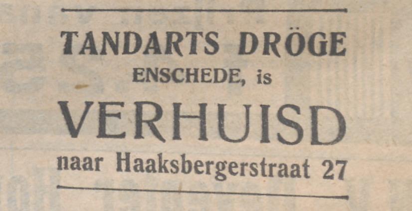 Haaksbergerstraat 27 Tandarts Dròge advertentie Overijsselsch dagblad 12-9-1932.jpg