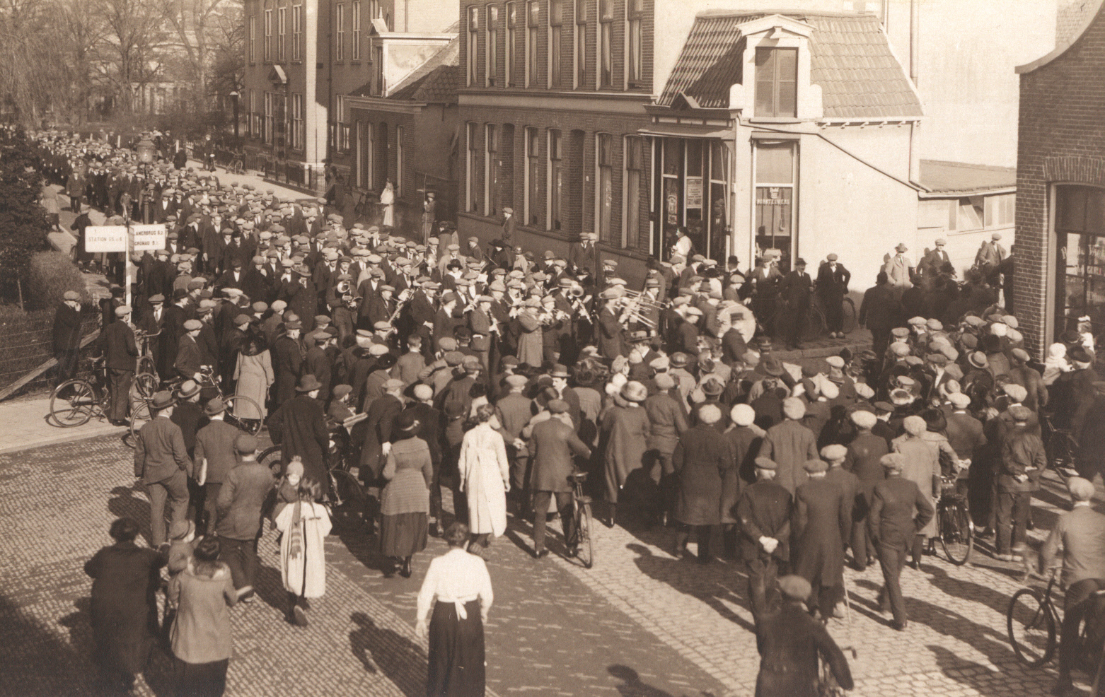 Haaksbergerstraat 37-41 hoek Getfertstraat links politiebureau Straatdemonstraties textielarbeidersbond De Eendracht  10-3-1924.jpg