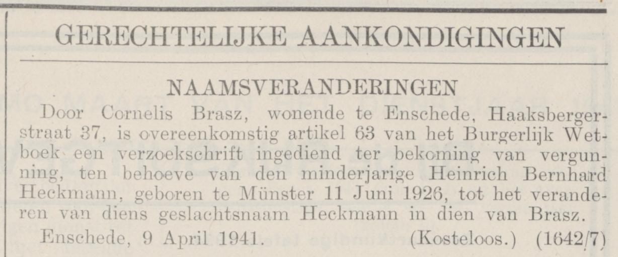 Haaksbergerstraat 37 Cornelis Brasz krantenbericht Nederlandsche staatscournat 16-4-1941.jpg
