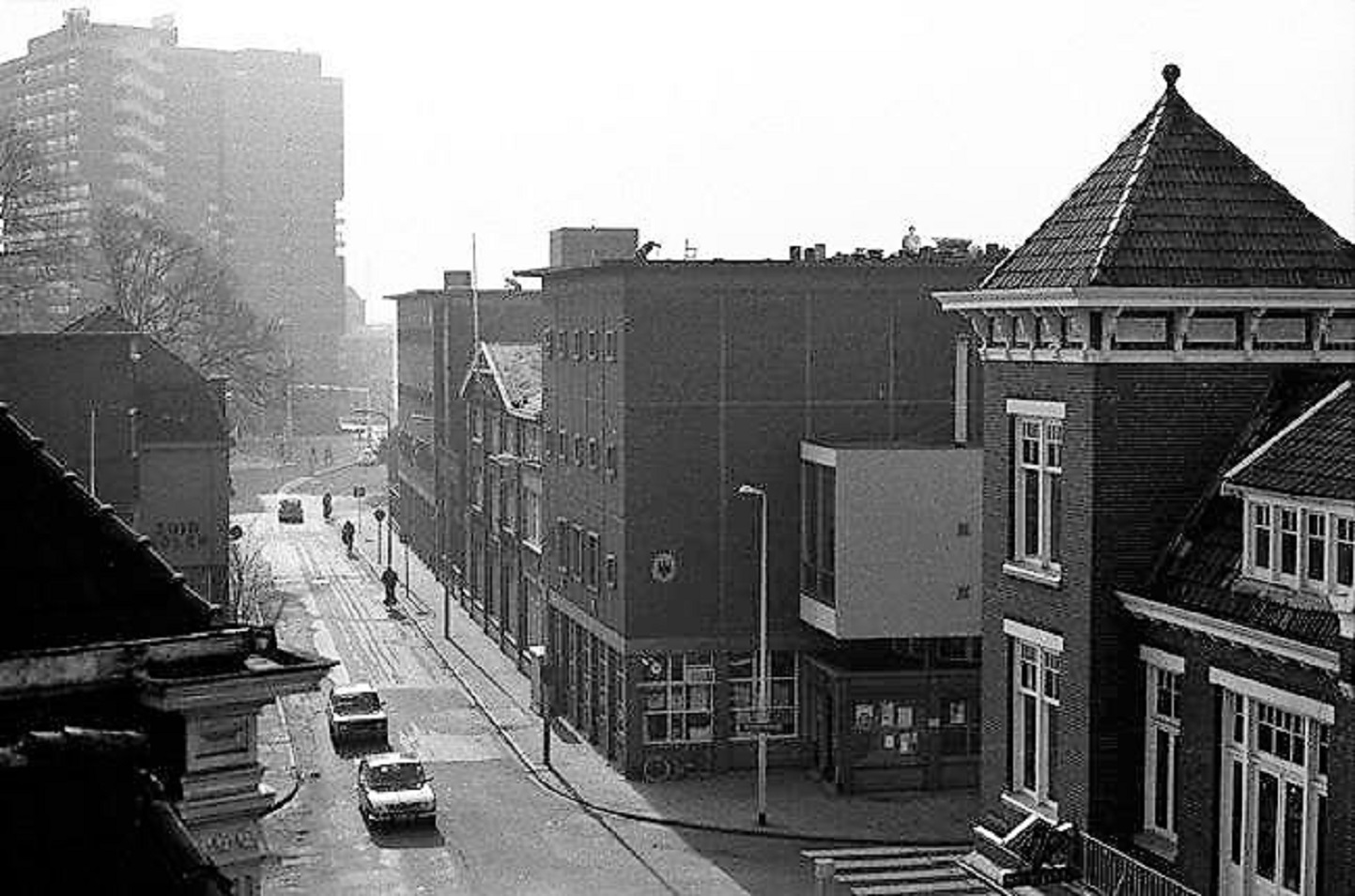 Haaksbergerstraat 31 rechts woninginrichting De Zuidmolen. Links de textielfabriek De Nijverheid en de ingang naar de Hermandad 8-5-1980.jpeg