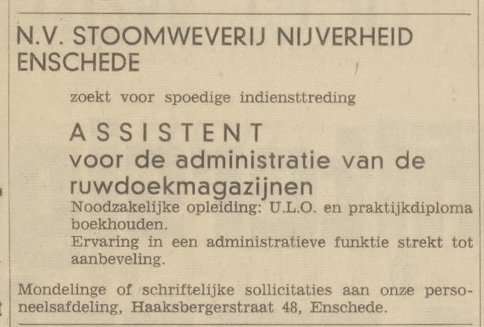 Nijverheid N. V. Stoomweverij fabriek Haaksbergerstraat 48 advertentie 4-7-1966
