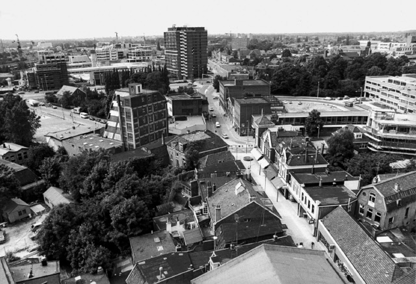 Haaksbergerstraat 48 Rechts de textielfabriek De Nijverheid op de hoek van de Nijverheidstraat, links woninginrichting De Zuidmolen. Links de Beltstraat. 22-5-1980.jpg
