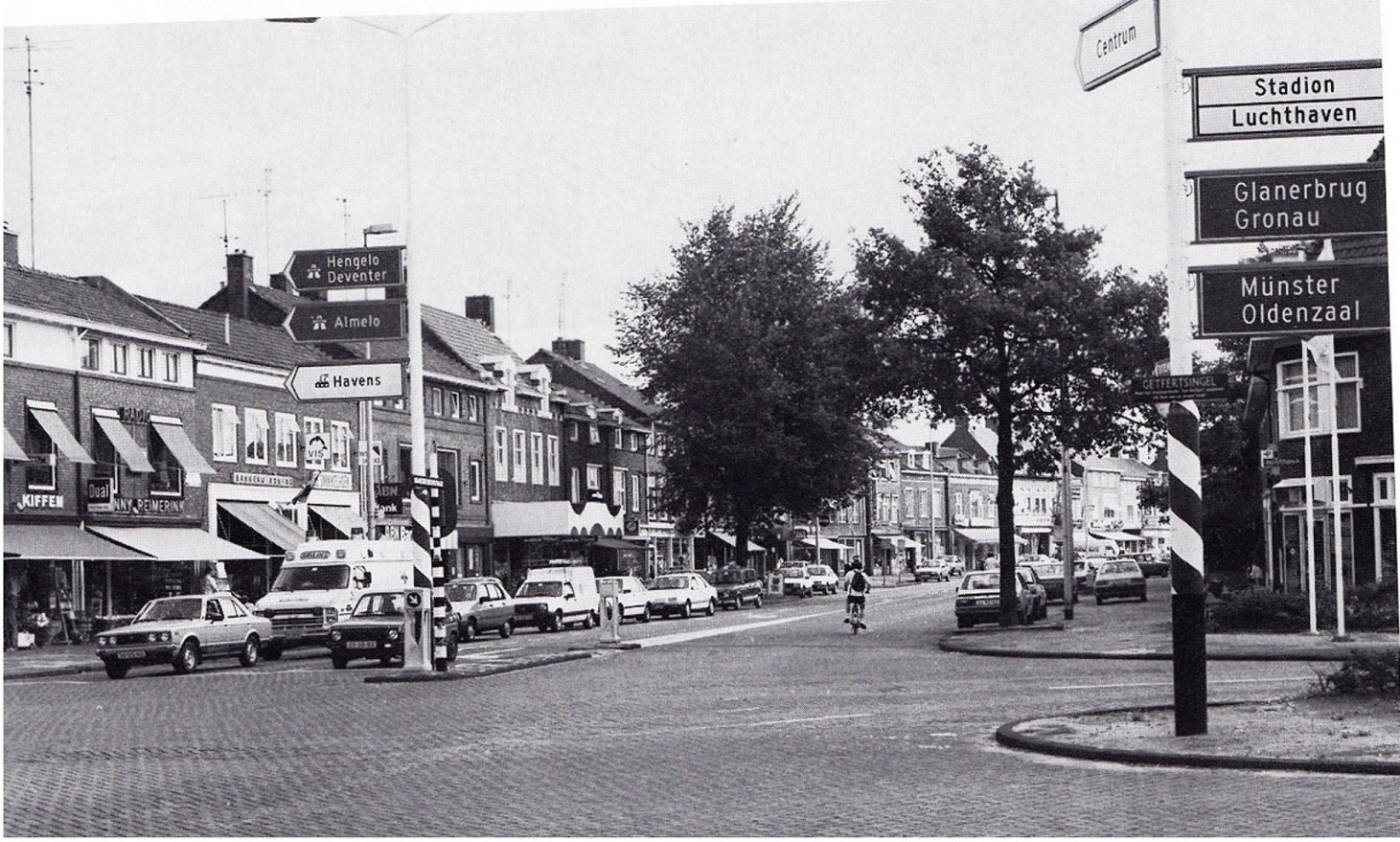 Haaksbergerstraat 358-368 winkels Reimerink vroeger ten Cate en Kiffen gezien vanaf Getfertsingel 1986..jpg