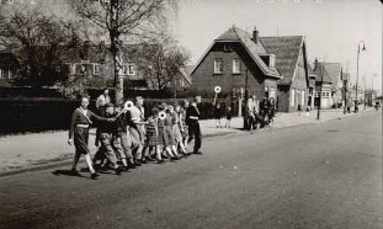 Haaksbergerstraat 376 hoek Pathmossingel 1 trouwstoet op de achtergrond de winkel van Dellemijn..jpg